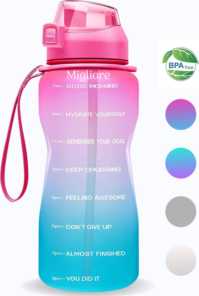 Deze luxe drinkfles is ontworpen om je te helpen meer water te drinken. De fles wordt geleverd met een stevige rietje, gemaakt van duurzame materialen. De fles heeft een capaciteit van 1 liter en heeft een handige tijdsmarkering aan de binnenkant. Zo kun je gemakkelijk je waterverbruik bijhouden door de tijdmarkeringen te volgen. Daarnaast bevat de fles ook een kleurrijke motivatie-afbeelding die je kan helpen om je doelen te bereiken. De fles is gemaakt van hoogwaardig en duurzaam BPA-vrij Tritan-materiaal. Daarnaast is de fles ook volledig lekvrij, waardoor je geen zorgen hoeft te maken over waterlekkage. Het slanke en moderne ontwerp maakt het ook gemakkelijk om mee te nemen. Bovendien is de fles ook verkrijgbaar in 600 ml en 2 liter versies. Kortom, de Migliore Luxe drinkfles is een perfecte partner om je waterverbruik te verhogen.